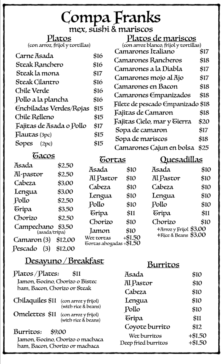 Welcome to Compa Franks - Madera, a culinary gem nestled at 1816 Howard Rd, Madera, CA. This family-owned restaurant is not just known for its authentic Mexican cuisine but also for its warm, welcoming atmosphere. The menu is a delightful blend of traditional Mexican dishes and unique offerings like Mexican sushi.